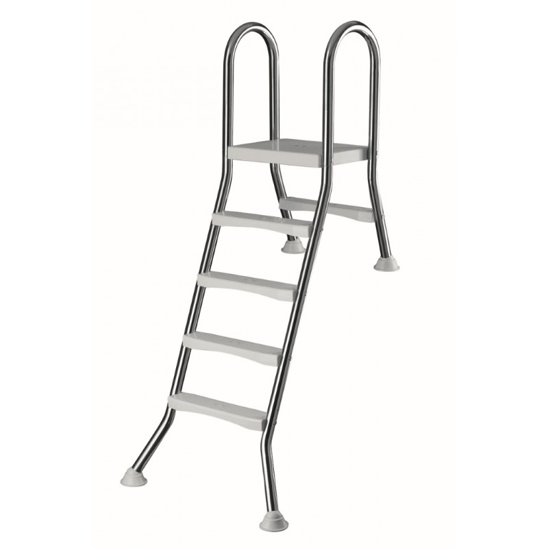 Bazenska lestev INOX z 4x1 nastopi je primerna za prostostoječe bazene, ki so delno vkopani. Lestev ima na vrhu tudi podest. Material: 2VA, nerjaveče jeklo fi 43 mm