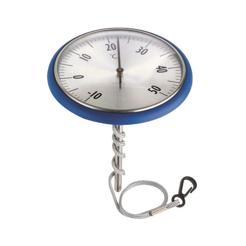Plavajoči termometer z obročem odlikuje velika številčnica in notranjost iz inoxa. Termometer se z vrvico pripne na bazensko lestev. Skupna višina termometra je 13,5 cm, premera 11cm.