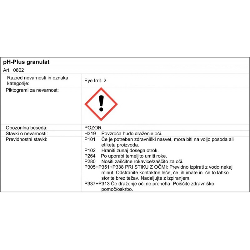 100 g pH-Plus Granulata zadošča, da 10 m3 vode zviša pH vrednost za približno 0,2.